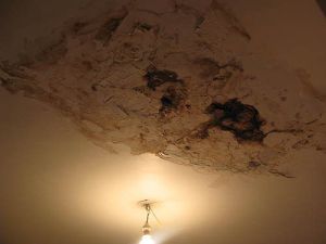 A Se trouve chez elle assise avec un parapluie ouvert au-dessus de sa tête et 2 seaux à terre recoltent l’eau tombant du plafond. On frappe à la porte c’est sa voisine B. avec un parapluie car il pleut dehors. Elle entre chez A